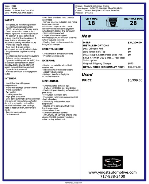 1 Owner, BMW 1 Series Convertible with a Hard to Find 6 Speed Manual Transmission. Clean Carfax. BMW Dealer Serviced with 24 Service History Records Available. 12/26 PA State Inspection.